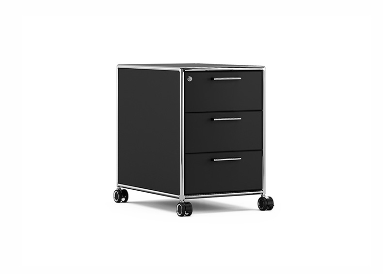 The modern mobile storage unit in black for the office or home office is solid on legs or manoeuvrable on castors. It holds all office utensils that are not currently needed. All containers are available with a lock for the storage of confidential documents.