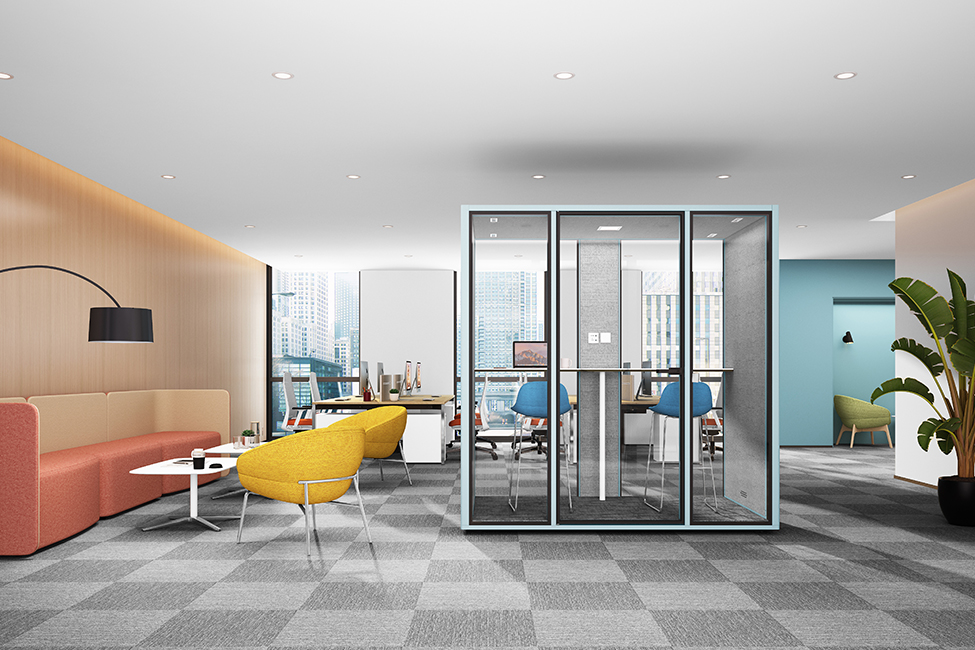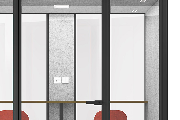 静音舱内部空间可以根据自己的喜好来选择适合的家具进行搭配设计,进一步提升空间的舒适性与自由度。面落地式隔音玻璃为舱内创造良好的天然采光条件,宽敞明亮的玻璃背板还可以增加设备带的应用,提供墙面电源插座,同时在视觉上可作为空间的分割装饰,满足功能性与美观性的巧妙平衡。
