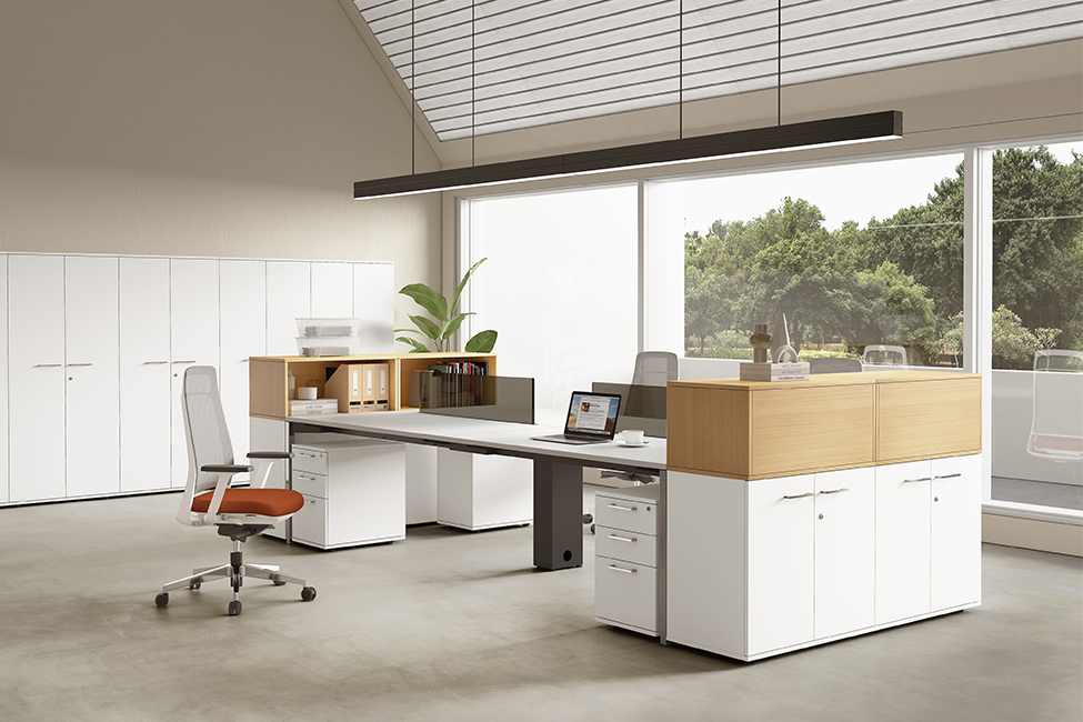 简约一体化设计,流畅明快的线条构成平滑的几何体块,能融入各种风格的办公空间。除了作为空间分隔和规划,也是公共存储区和私人办公室的理想选择。
