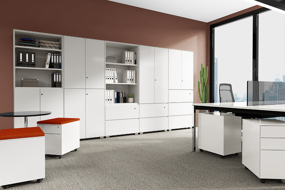 结合存储需求,FOLIO的模块化特性也可实现组合高柜的设计,并且运用色彩来打造视觉效果:柜框和柜门采用不同色系,在视觉上形成深浅对比,突出柜体线条感和立体感,丰富整个办公空间的风格,提升整体设计感。